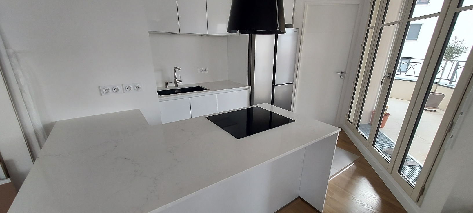 Plan de travail en quartz Unistone Carrara Misterio finition polie