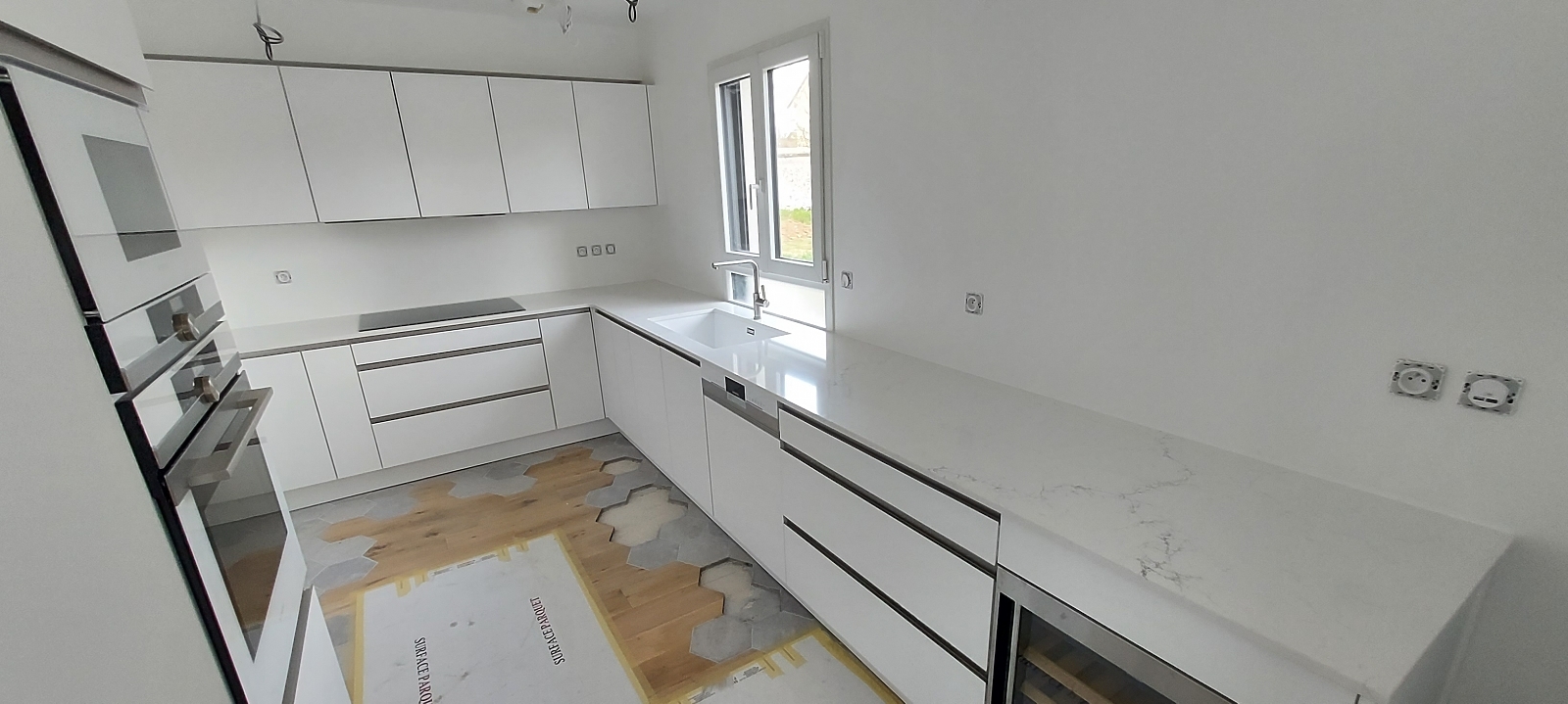 Plan de travail en quartz Unistone Carrara Misterio finition polie